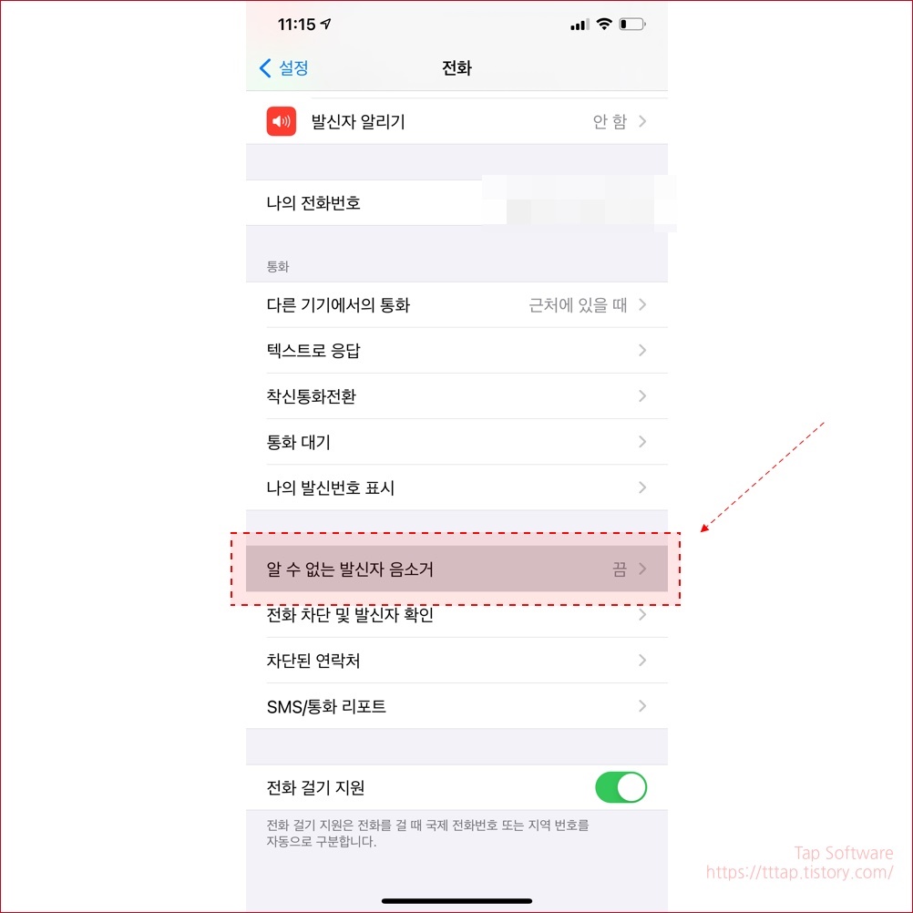 ▼ 3. 전화 설정에서 알 수 없는 발신자 음소거 메뉴를 선택합니다.