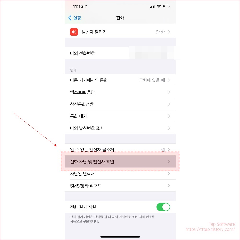 ▼ 5. 다음으로 전화 차단 및 발신자 확인 메뉴로 이동합니다.