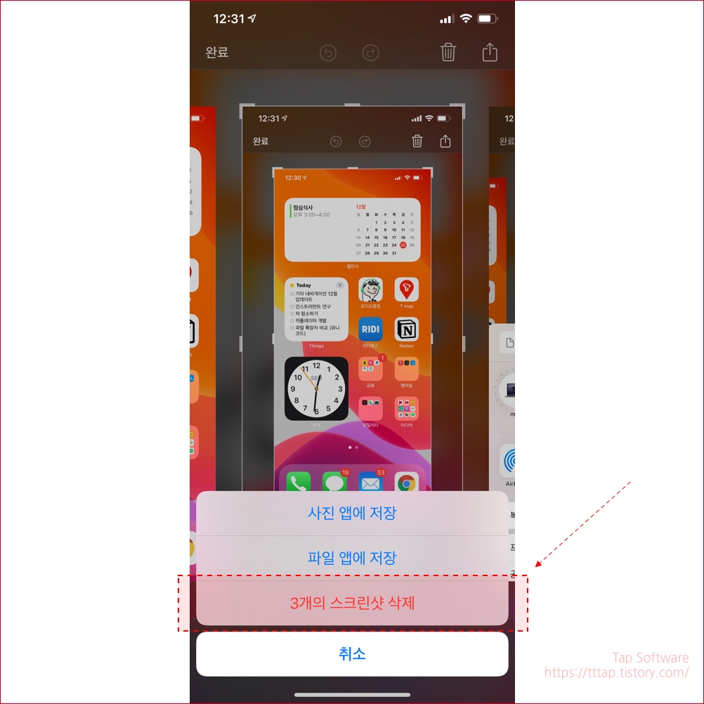 ▼ 3. 3개의 스크린샷 삭제를 눌러서 사진을 지울 수 있습니다. 이때 공유만 되고 사진첩에 사진이 저장되지 않아서 좋습니다.
