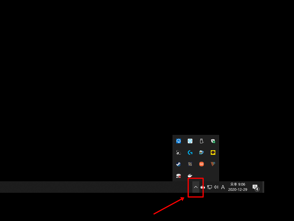▼ 1. 하드디스크가 연결되어 있다면 다음과 같이 작업표시줄의 ∧ 표시 버튼을 눌러줍니다. 윈도우 우측하단에 메뉴가 있습니다.