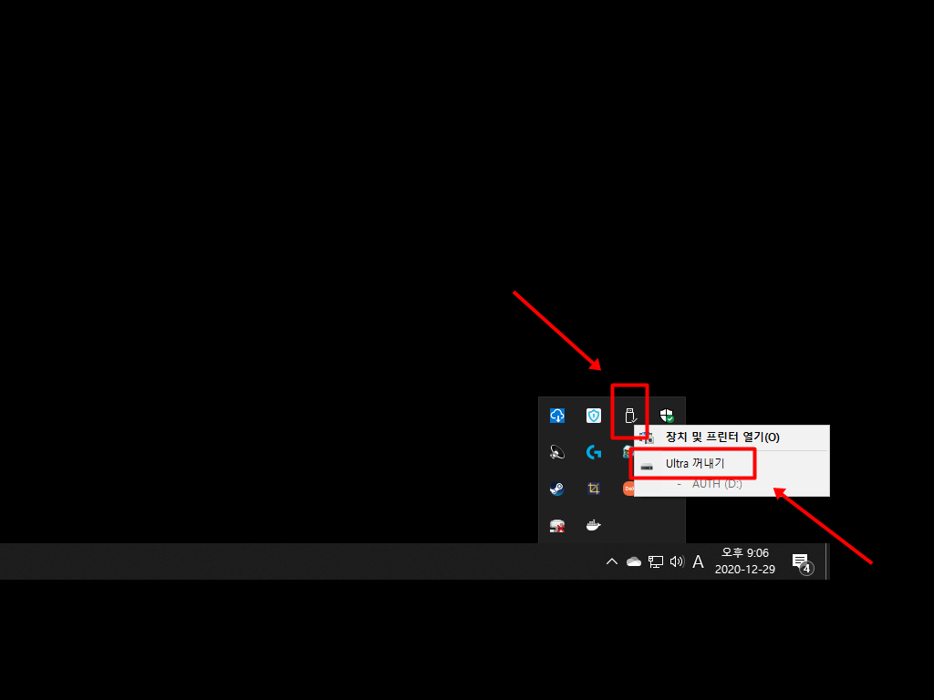 ▼ 2. 이제 USB 모양의 아이콘을 마우스 오른쪽 버튼으로 눌러서 메뉴를 불러옵니다. 그리고 꺼내기 버튼을 누릅니다. 만약 연결된 장치가 많으면 여러개가 나올 수 있습니다.
