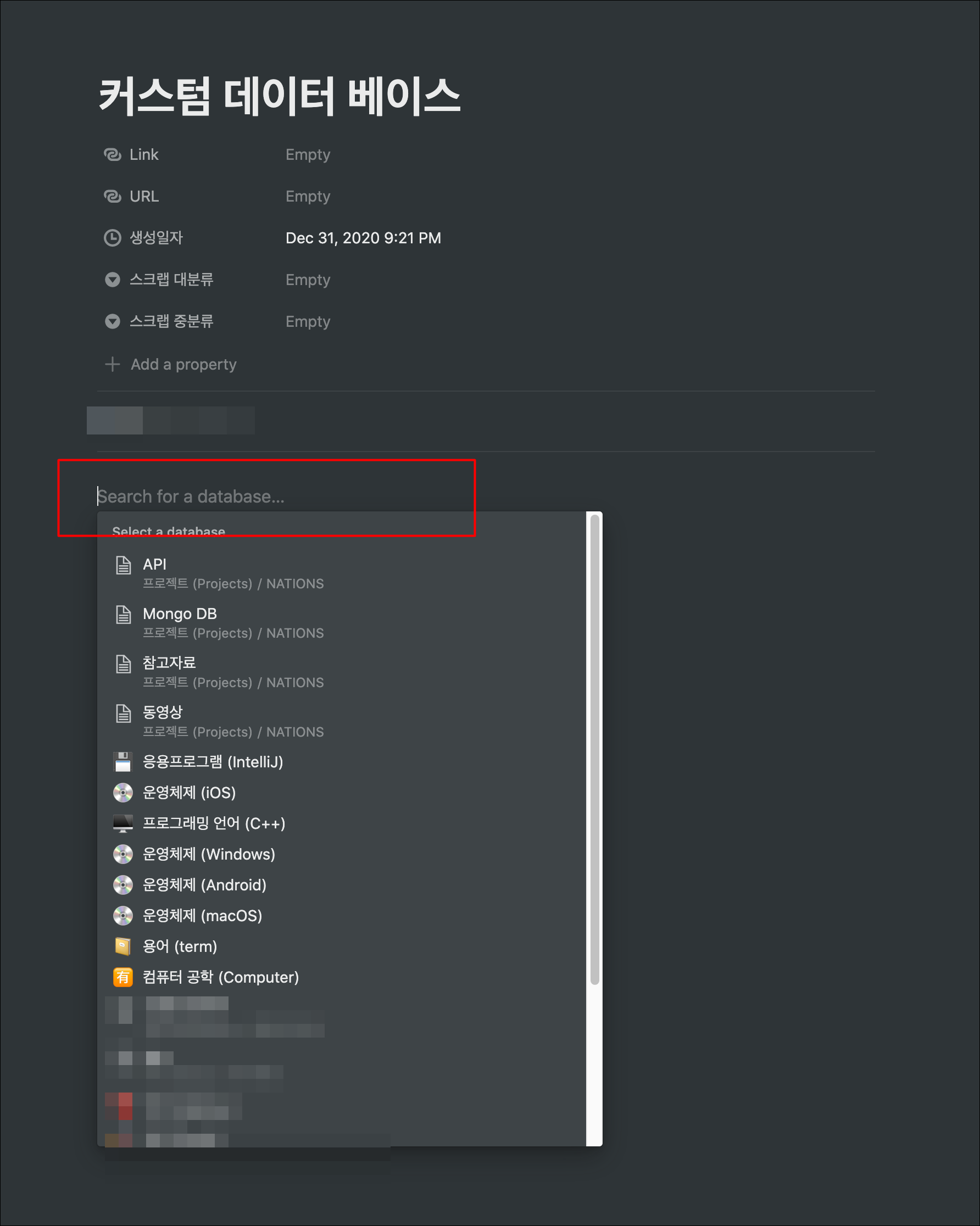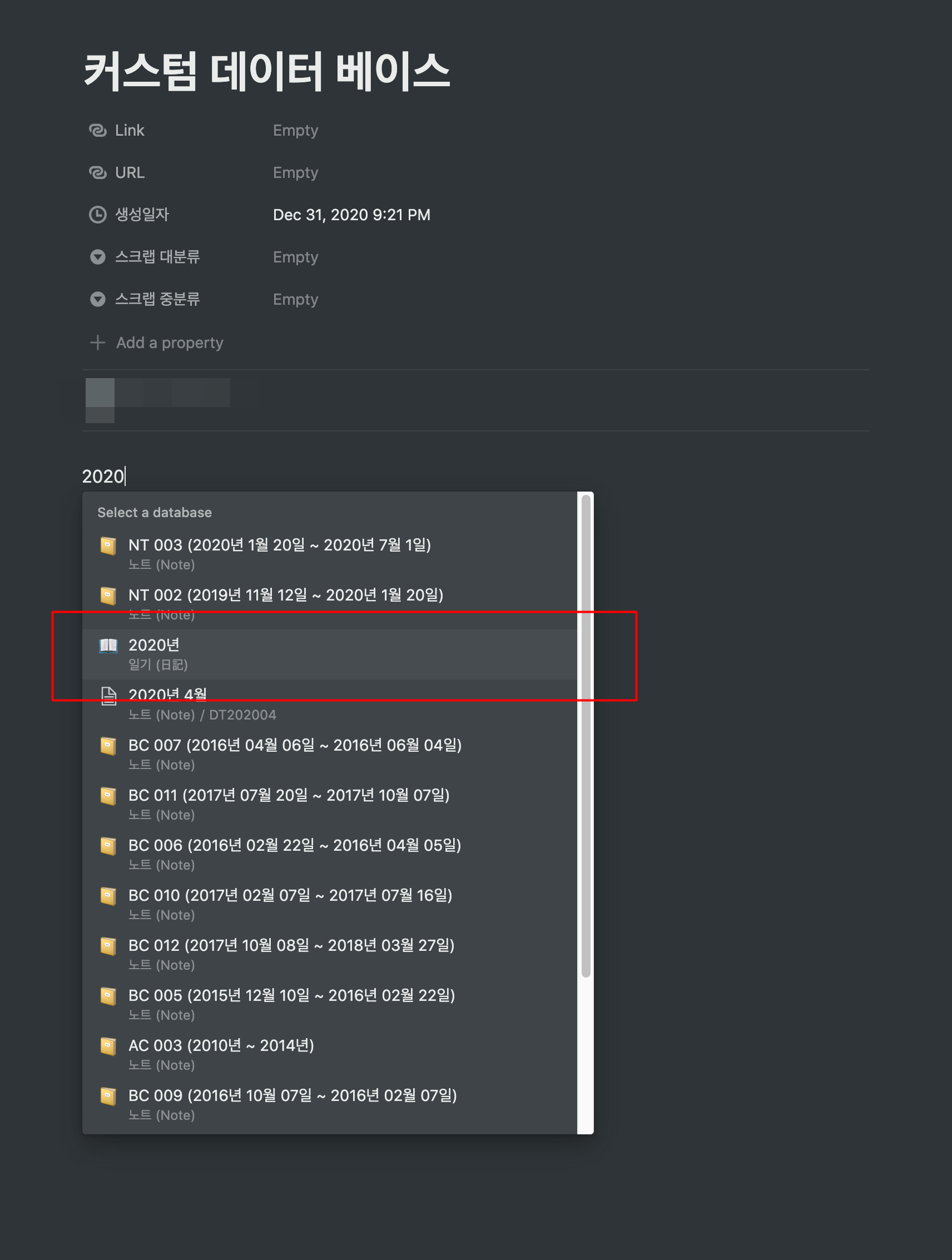 ▼ 2. 메뉴를 선택하자마자 Search for a database 라는 텍스트 필드에 포커싱 되면서 하단에 자주 사용했던 데이터 베이스가 보일겁니다. 여기에 데이터베이스로 만들 데이터베이스를 검색합니다. 저는 2020이라고 입력했습니다. 2020년 일기를 뷰로 만들기 위해서 입니다.