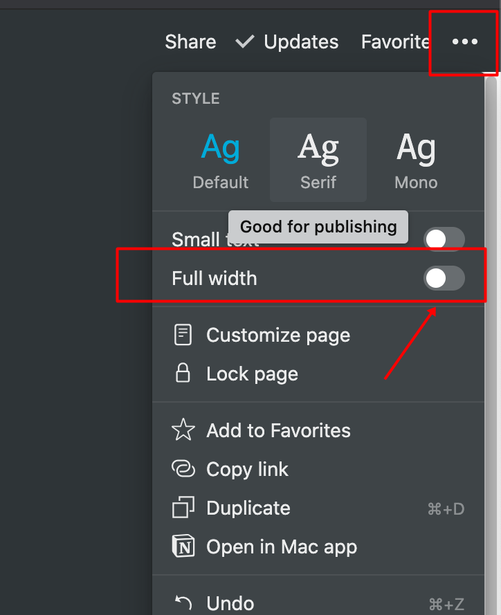 ▼ 5. 우측 상단의 메뉴를 선택하고 Full width 스위치 메뉴를 켜줍니다.