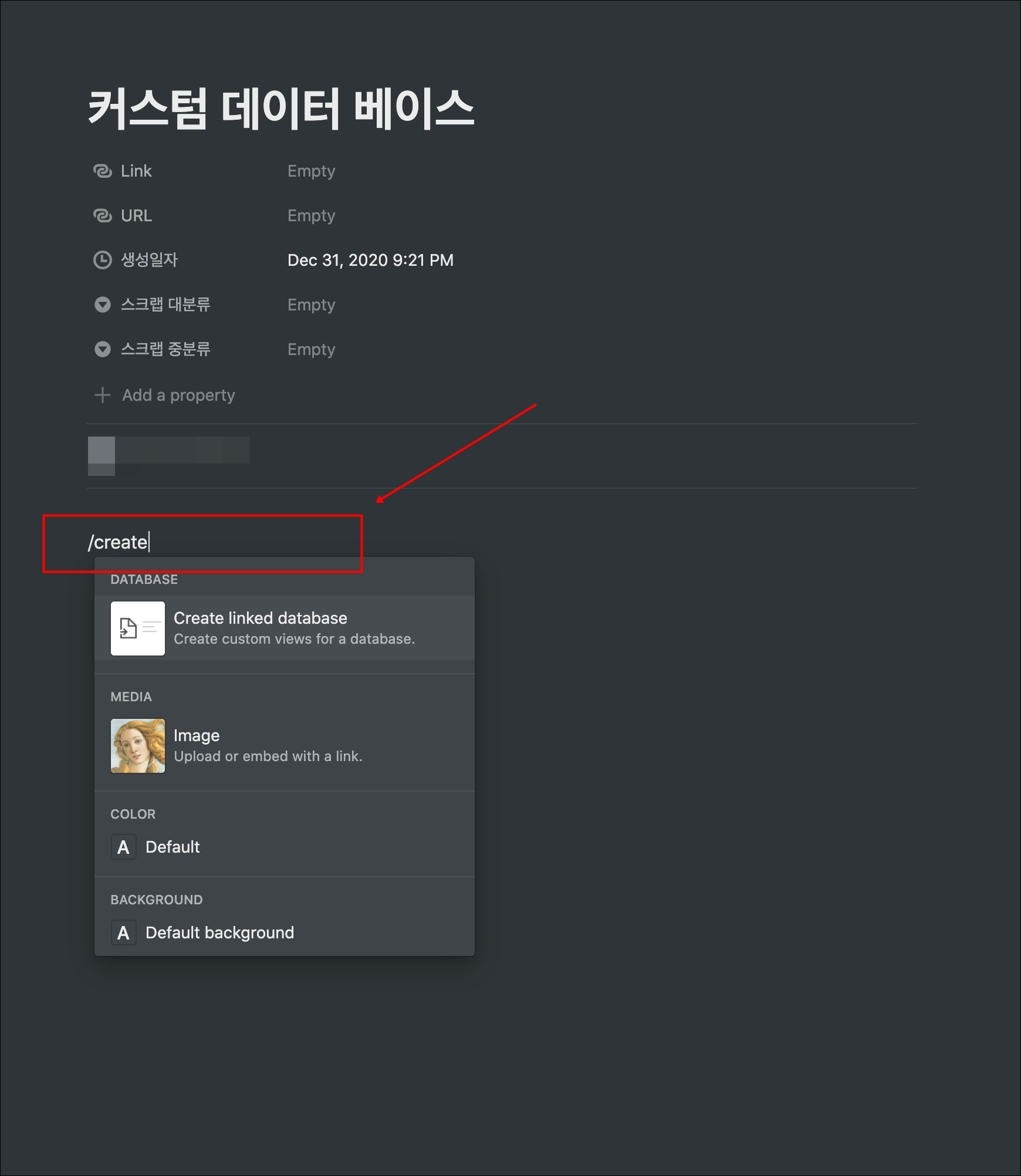 ▼ 1. 우선 /create 라고 입력합니다. 그리고 첫번째 노출된 Create linked database 메뉴를 선택합니다.