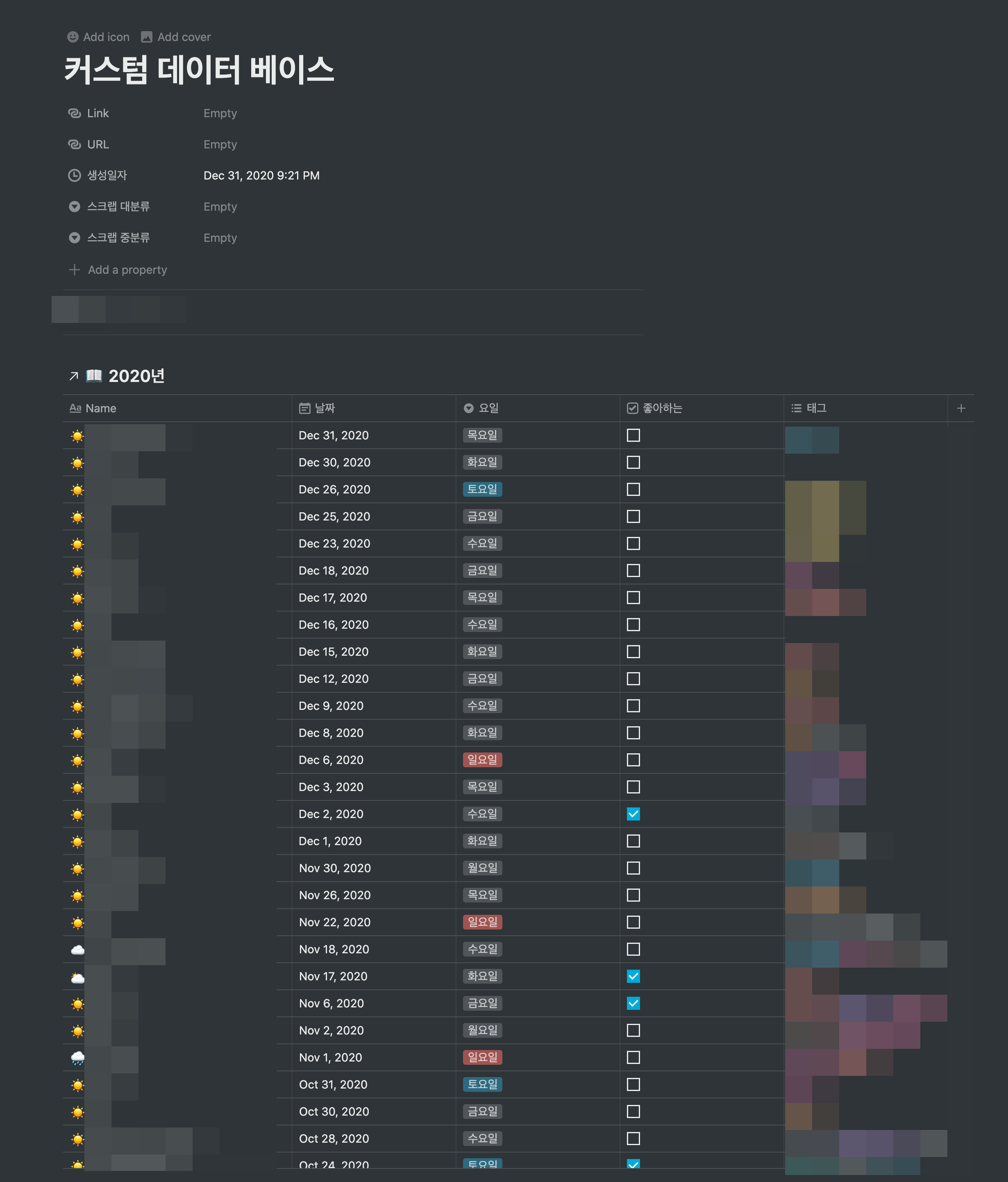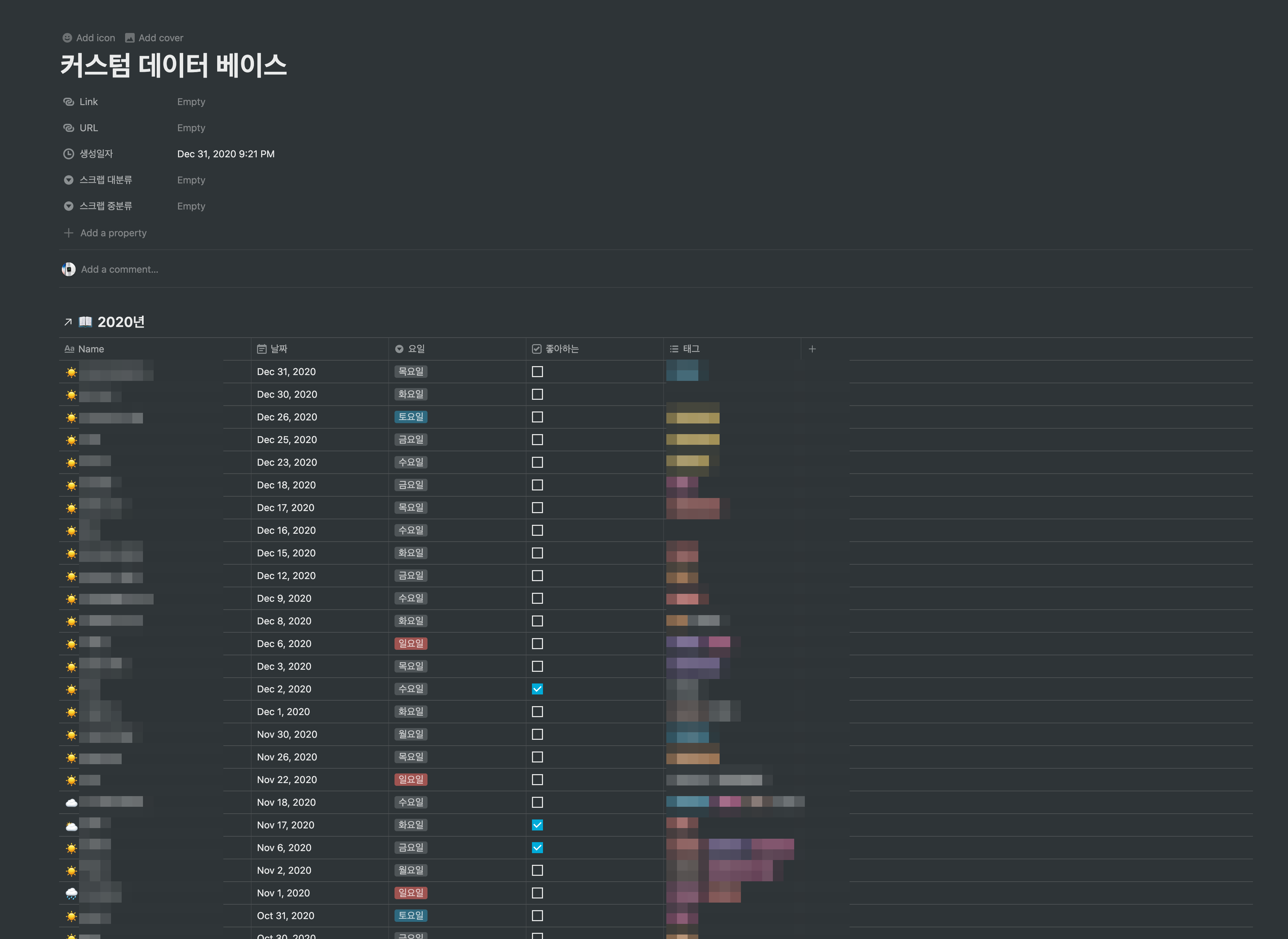 아주 쉽게 데이터 베이스 뷰를 만들어보았습니다. 이 기능을 활용하면 다양하게 만들어진 데이터 베이스를 관리하기 좋을 것 같네요. 오늘을 마지막으로 2020년이 끝나는 시점에 일기들을 한 군데 모아놓고 나중에 시간이 나면 봐야겠어요. 코로나로 인해서 진짜 힘들었던 2020년입니다. 새해에는 모두 행복했으면 좋겠습니다.