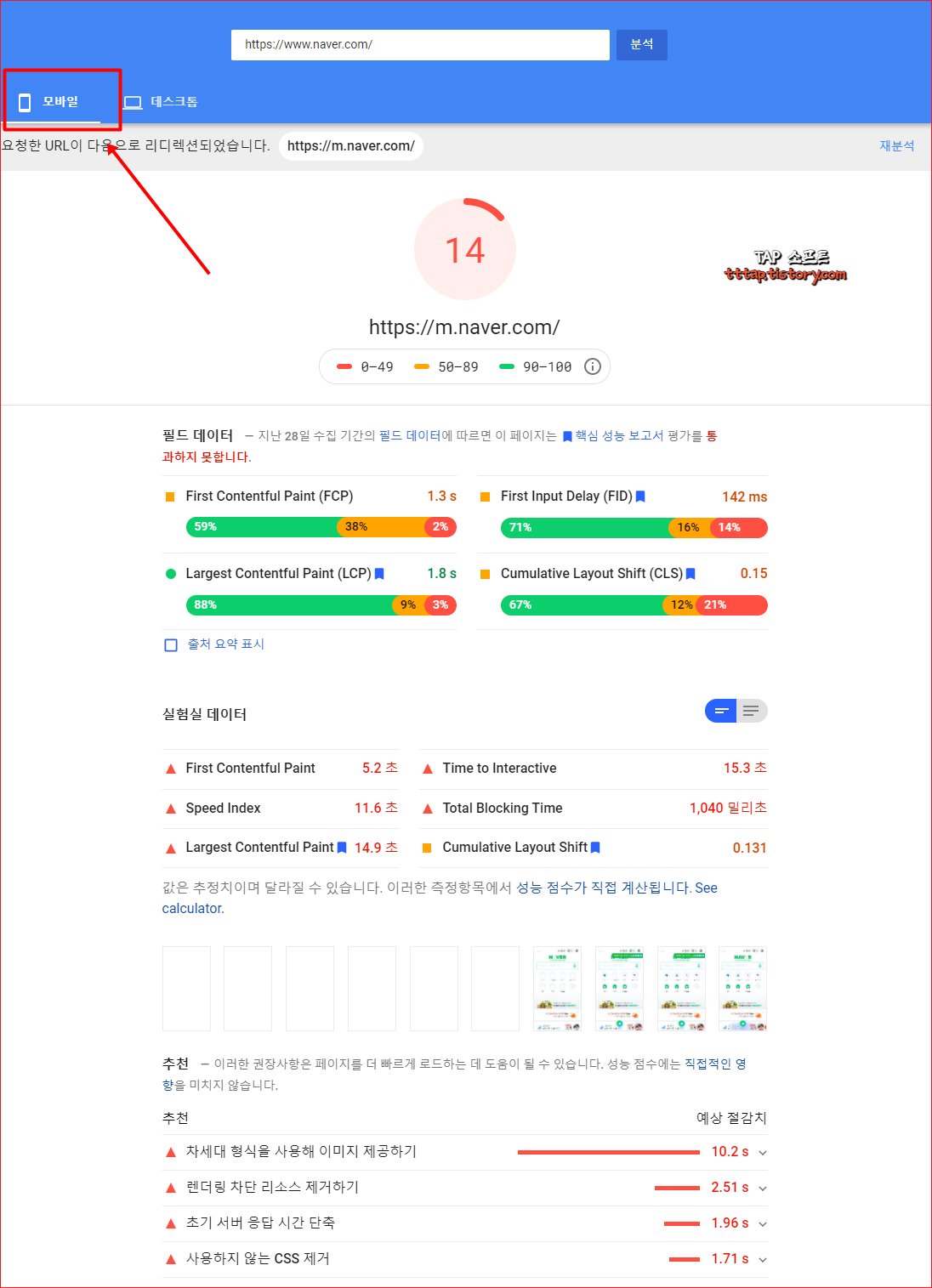 ▼ 3. 웹 사이트 분석이 끝나면 모바일 속도 부터 표시됩니다. 데스크톱 탭을 누르면 화면이 전환됩니다. 각 측정 요소에 따라서 로딩 속도를 개선할 수 있는 방법을 표시해줍니다. 네이버 메인화면은 콘텐츠가 많아서 그런지 품질이 그다지 좋아 보이지는 않습니다.