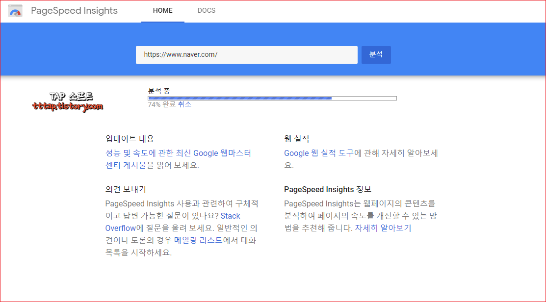 ▼ 2. 다음과 같이 웹 사이트 속도 분석 시간이 조금 걸려요. 수 초가 지나면 분석 결과가 나옵니다.