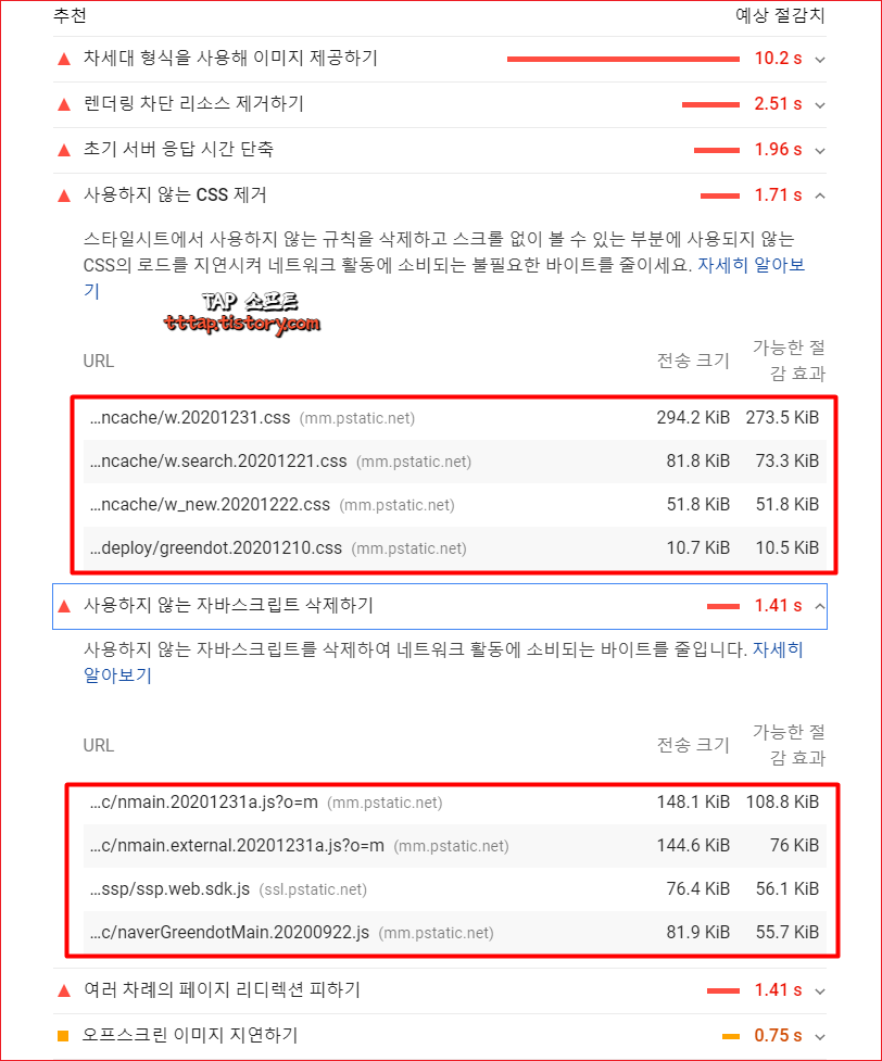 ▼ 5. 사용하지 않는 자바스크립트나 CSS는 제거하는 것이 좋겠습니다. 그 밖에 속도를 절감할 수 있는 여러 요소를 제안합니다.
