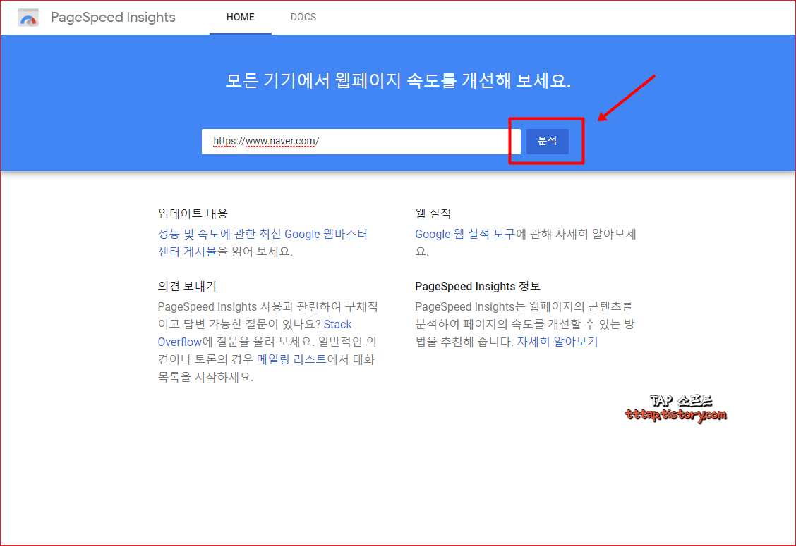 ▼ 1. Page Speed Insight 웹 사이트로 이동해서 분석에 사용할 웹 사이트 주소를 입력하고 분석 버튼을 누릅니다. 저는 테스트로 네이버 웹 URL을 입력했습니다.