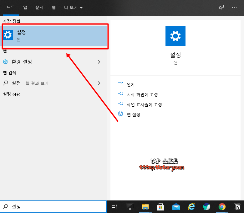 ▼ 1. 검색에 설정을 입력하고 설정 앱을 실행합니다.