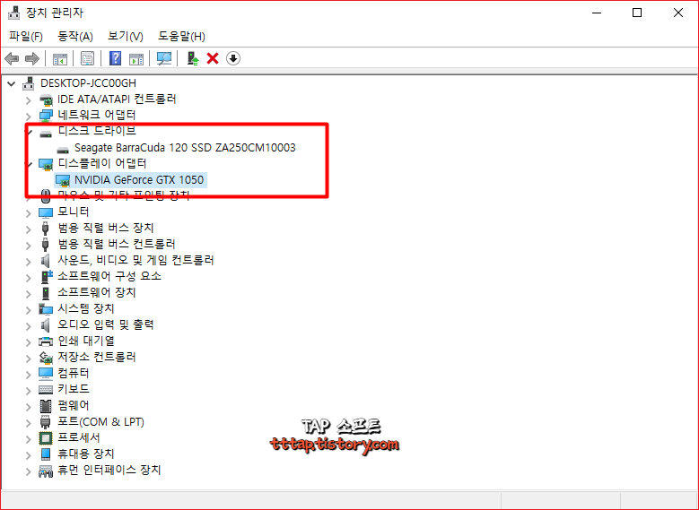▼ 4. 디스플레이 어댑터란 그래픽 카드를 말합니다. GTX 1050 그래픽카드를 사용하네요. 하드 디스크는 시게이트 SSD 입니다.