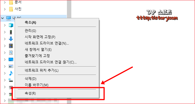 ▼ 1. 내 PC 아이콘을 오른쪽 버튼을 눌러서 속성 메뉴를 선택합니다.