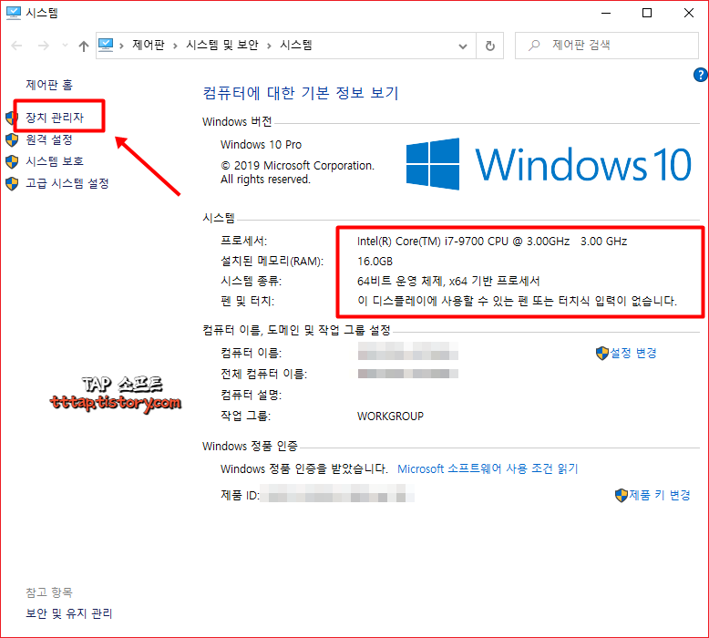 ▼ 2. 이제 바로 시스템을 확인할 수 있습니다. 램은 16GB 이며 CPU는 i7-9700 이라는 것을 확인할 수 있습니다. 이 정도면 다른 사람에게 PC 사양을 바로 말해줄 수 있겠죠? 하지만 중요한 부품이 2개 더 있습니다. 바로 그래픽 카드와 하드디스크입니다. 장치 관리자 버튼을 눌러줍니다.